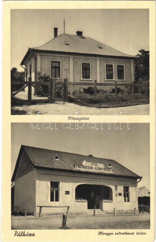 Beschreibung: Pálháza, Községháza, Hangya Fogyasztási Szövetkezet üzlete és saját kiadása