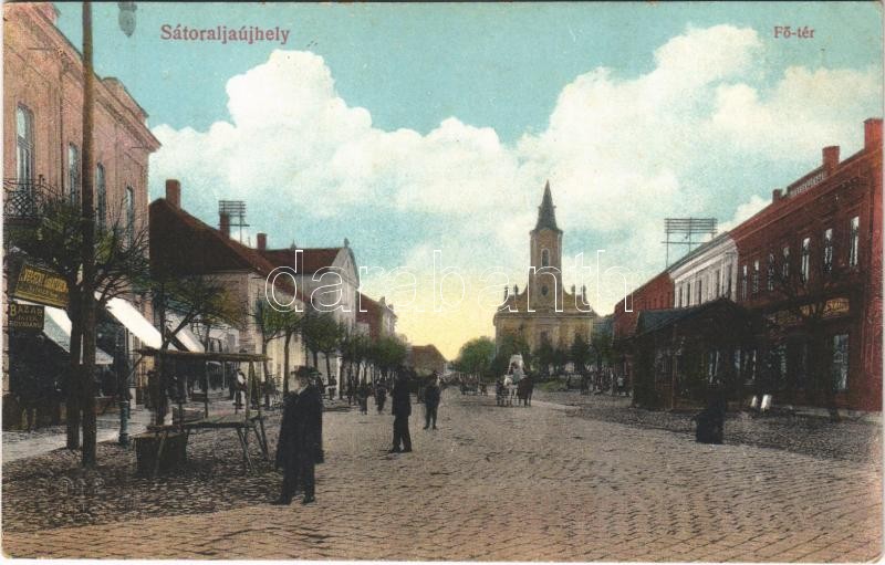 Beschreibung: Sátoraljaújhely, Fő tér, templom, üres piaci stand, takarékpénztár, Sattler Samu verseny ruhaterem üzlet. MÁV Levelezőlapárusítás
