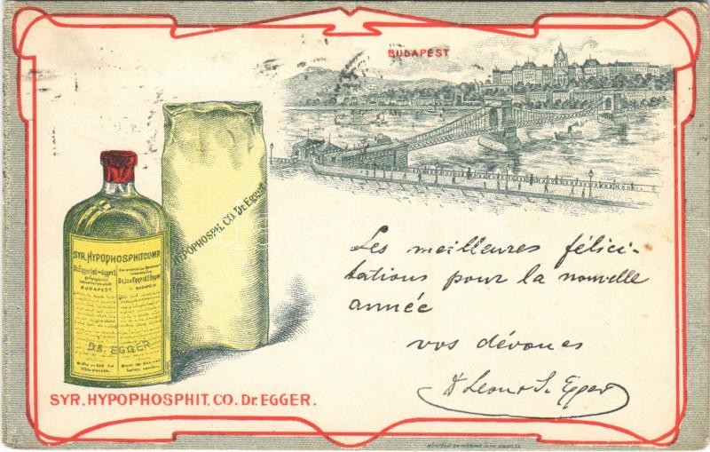 1907 Syr. Hypophosphit. Co. / Dr. Egger Leó és Egger Izidor gyógyszerészek köhögés elleni szirupjának reklámja. Budapest VI. Váci körút 17. (Bajcsy-Zsilinszky út) / Hungarian pharmacists' cough syrup, medicine advertisement. Art Nouveau litho (EK)