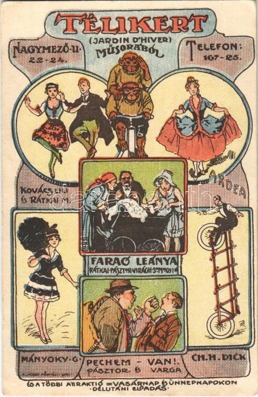 1917 Télikert (Jardin d'Hiver) műsorából. Budapest, Nagymező u. 22-24.: Kovács Lili és Rátkai M., Ardea, Faragó Leánya, Mányoki G., Pechem Van!, Ch. H. Dick és a többi attraktió vasárnap és ünnepnapokon délutáni előadás / Hungarian vaudeville theater advertisement (EK)