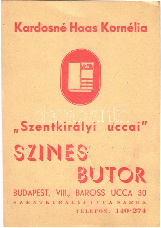 Kardosné Haas Kornélia "Szentkirályi uccai" Színes Bútor áruházának reklámlapja. Budapest VIII. Baross utca 30. Szentkirályi utca sarok / Hungarian furniture shop advertisement card + "100 éves a magyar ipar és kiállításügy 1941. május 4. Budapest" So. Stpl. (EK)