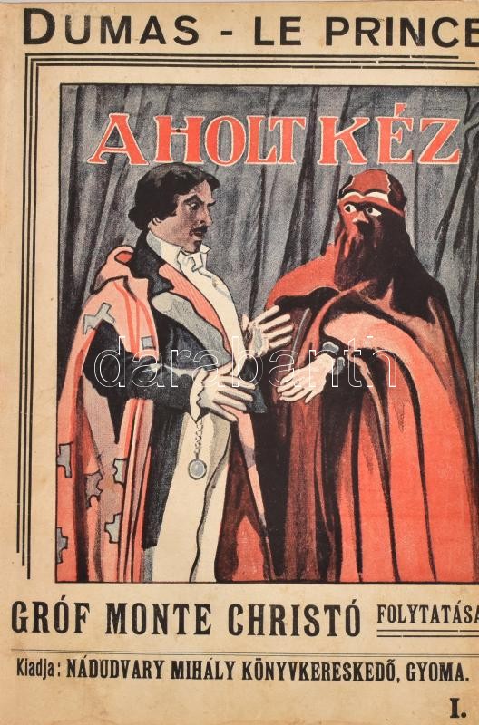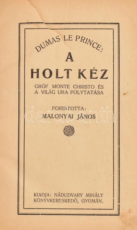 Dumas Le Prince: A holt kéz. Gróf Monte Christop és a világ ura folytatása. Ford.: Malonyai János. Gyoma,én.,Nádudvary Mihály, (Mezőberény-ny.), 288 p. Átkötött egészvászon-kötés, bekötött elülső illusztrált borítóval, szakadt címlappal.