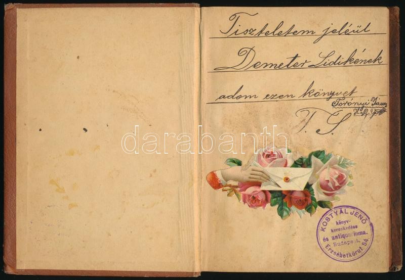 Kátay A.: Üdvözletek és bókok könyve, vagyis utasitás az illemre és finom modorra, ... Bp., 1887, Robicsek Zsigmond, 156+4 p. Kiadói kopott egészvászon-kötésben, szakadt címlappal.