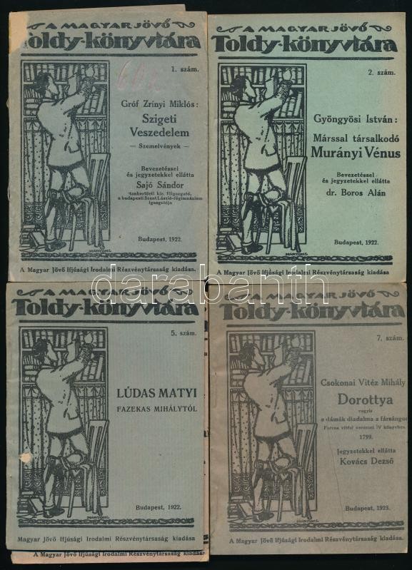 Toldy-könyvtár 4 klf száma (1.,2.,6, 7.): Gróf Zrínyi Miklós: Szigeti veszedelem (szemelvények). Gyöngyösi István: Márssal társalkodó Murányi Vénus. Kármán József: Fanni hagyománya. Csokonai Vitéz Mihály: Dorottya. Budapest, A Magyar Jövő Ifjúsági Irodalom Részvénytársaság kiadása, 1922-1923. Papírkötésben, az egyiken szakadással.