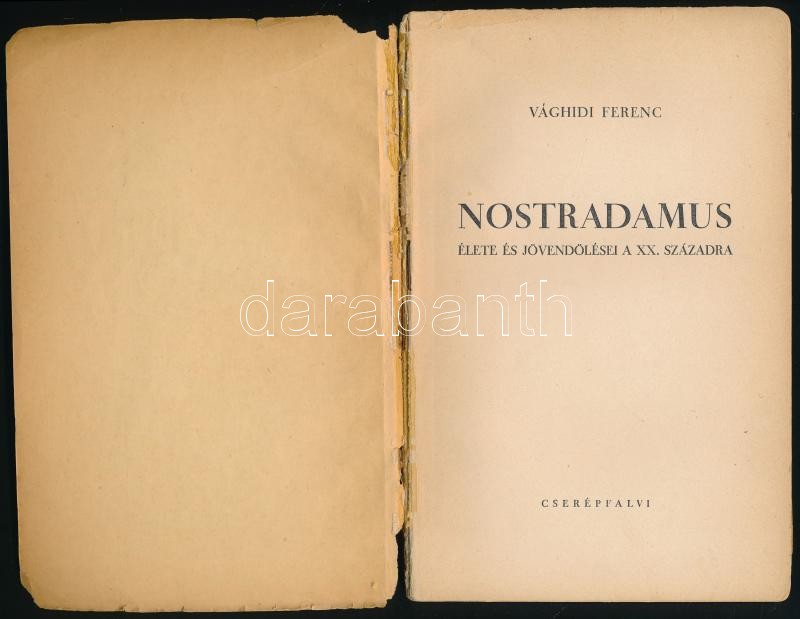 Vághidi Ferenc: Nostradamus élete és jövendölései a XX. századra. Bp.,... https://www.darabanth.com/de/396-Fernauktion/396.0/Bucher/Bucher-Andere-kuriositaten~1000024/Vaghidi-Ferenc-Nostradamus-elete-es-jovendolesei-a-XX-szazadra-Bp-1940-Cserepfalvi-Kia~II2408742