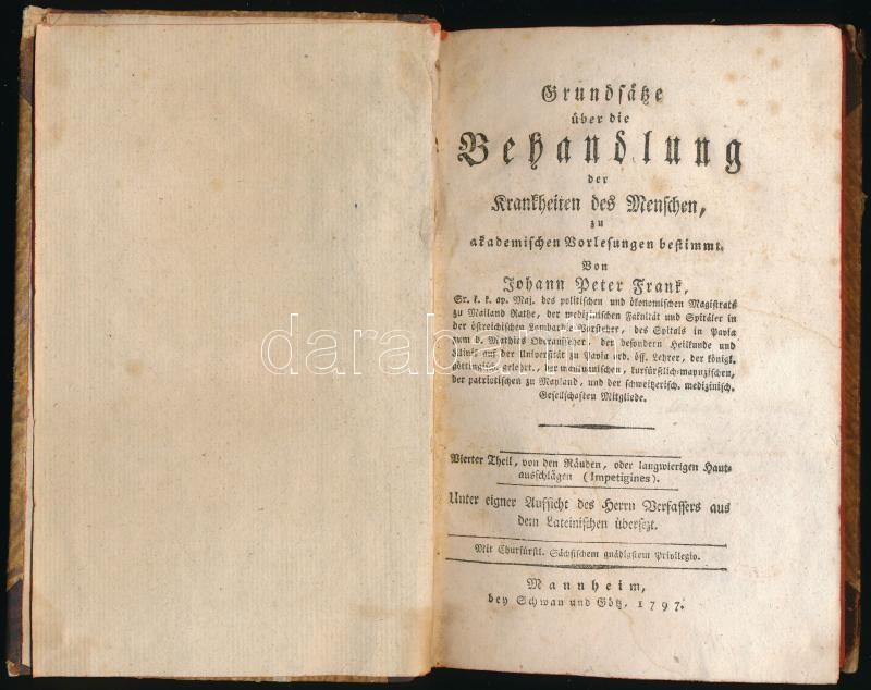 Johann Peter Frank: Grundsätze über die Behandlung der Krankheiten des Menschen, zu akademischen Vorlesungen bestimmt. Vierter Theil. Mannheim, 1797, Schwan und Götz, 231 p. Német nyelven. Korabeli aranyozott gerincű félbőr-kötés, kopott borítóval, sérült gerinccel, festett lapélekkel, kissé foltos lapokkal.