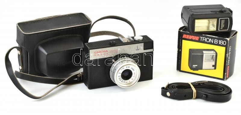 Lomo Smena 8M fényképezőgép T-43 40mm f/4 objektívvel, eredeti tokjában, kis foltoktól eltekintve jó állapotban + Revue Tron B180, eredeti dobozában és Panasonic PE-145 vakukkal, szíjjal.