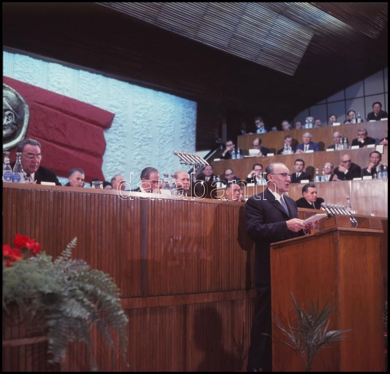 1970 Kádár János (1912-1989) politikus a szónoki emelvényen, mögötte a kép sarkában Leonyid Iljics Brezsnyev (1906-1982) szovjet politikus, vintage DIAPOZITÍV felvétel, 5,6x6 cm