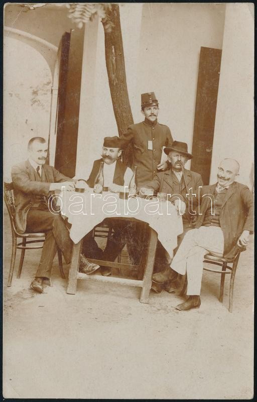 cca 1910 Söröző társaság katonával, fotólap, 14×9 cm https://www.darabanth.com/de/396-Fernauktion/396.0/Fotografie/Foto~500023/cca-1910-Sorozo-tarsasag-katonaval-fotolap-14C3979-cm~II2409931
