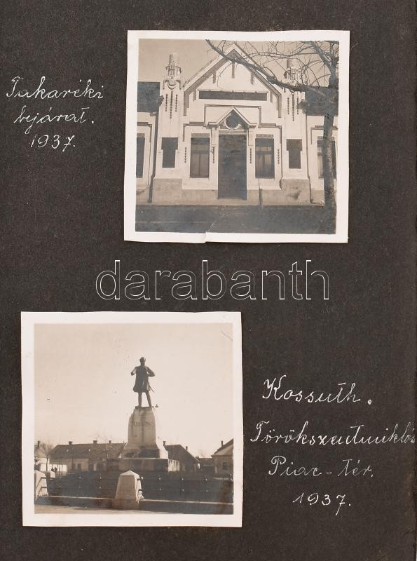 cca 1937-1938 Családi fotóalbum, 61 benne fotóval, benne fotókkal Törökszentmiklósról, Triesztről, Velencéről, Abbáziáról, Budapesti állatkertről, vadasi tanyáról, Splitről, Trogirről, Solinről (Salona), köztük 3 db képeslappal, az albumlapokon feliratozva, korabeli kopott félvászon fotóalbumban, az album teste kijár, 9x13 cm és 6x6 cm közötti méretben
