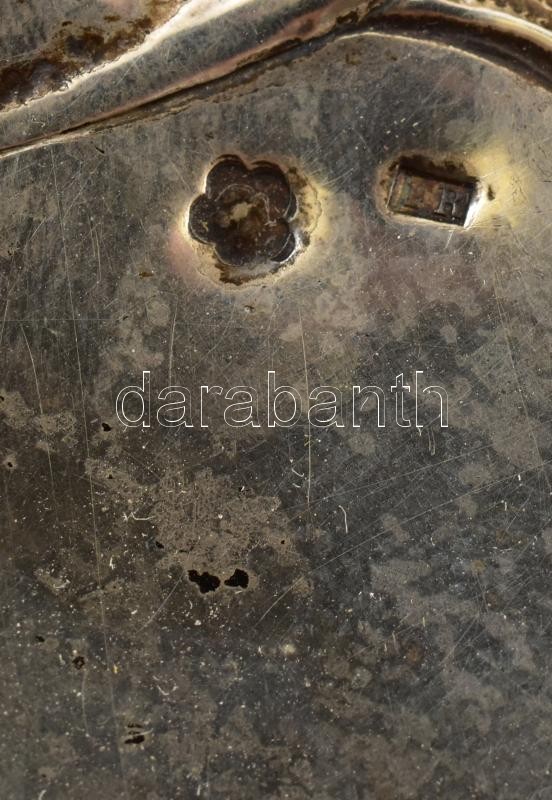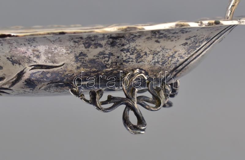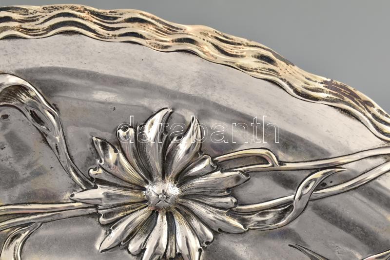 Beschreibung: Szecessziós ezüst kínáló tál. Ezüst (Ag). Lábakon. 635 g XX. sz. eleje, magyar. FR mesterjeggyel. 34x25 cm