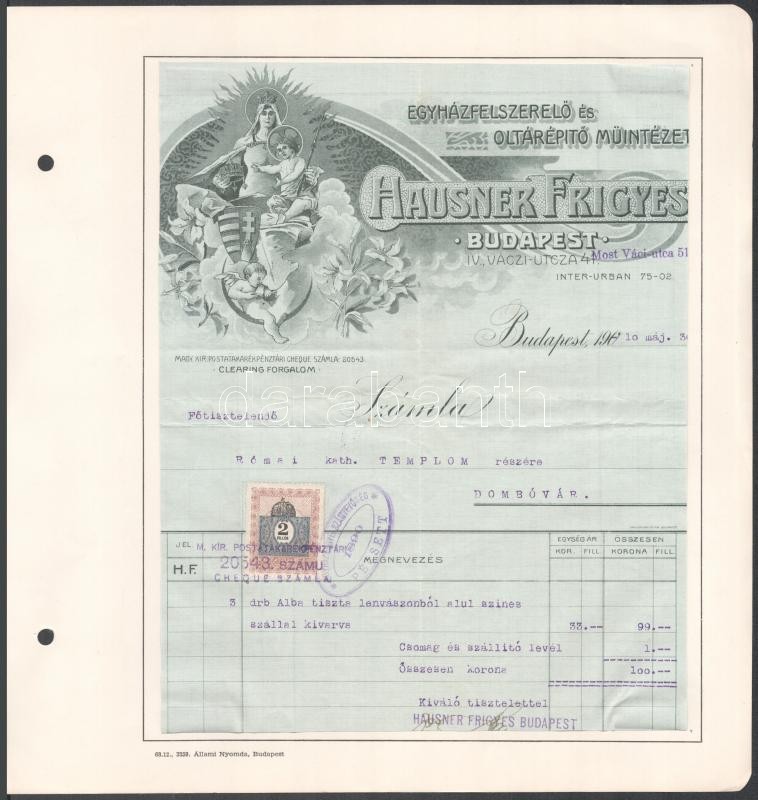 1910 Bp., Egyházfelszerelő és Oltárépítő Műintézet Hausner Frigyes dís... https://www.darabanth.com/de/396-Fernauktion/396.0/Kunst-Dokumente-andere-Sammelgebiete/Dokument~500021/1910-Bp-Egyhazfelszerelo-es-Oltarepito-Muintezet-Hausner-Frigyes-diszes-fejleces-szaml~II2407054