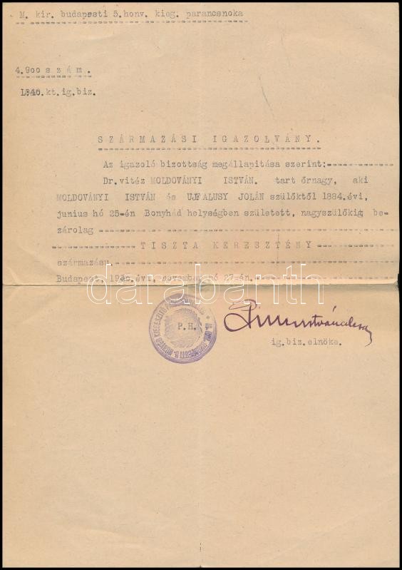 Beschreibung: 1940 Származási igazolvány Dr. vitéz Moldoványi István tartalékos őrnagy részére, M. Kir. Budapesti 5. Honvéd Kiegészítő Parancsnokság