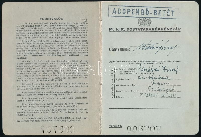 1946 Magyar Királyi Postatakarékpénztár Budapest adójegyes betétkönyv https://www.darabanth.com/de/396-Fernauktion/396.0/Kunst-Dokumente-andere-Sammelgebiete/Dokument~500021/1946-Magyar-Kiralyi-Postatakarekpenztar-Budapest-adojegyes-betetkonyv~II2409006