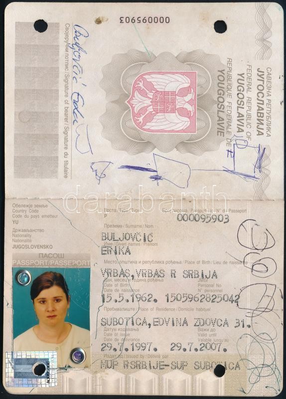 1997 Jugoszláv útlevél, magyar vízummal, bélyegzésekkel, néhol gyerekf... https://www.darabanth.com/de/396-Fernauktion/396.0/Kunst-Dokumente-andere-Sammelgebiete/Dokument~500021/1997-Jugoszlav-utlevel-magyar-vizummal-belyegzesekkel-nehol-gyerekfirkaval~II2404501