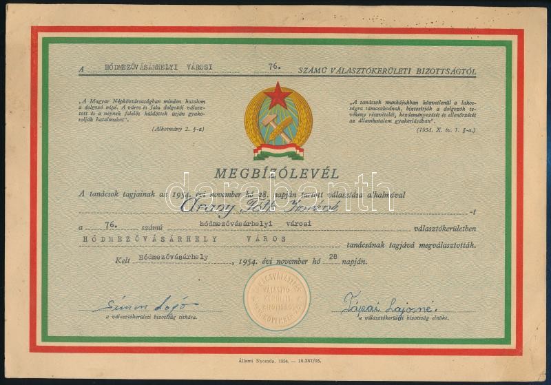 1954 Megbízólevél a tanácsok tagjainak https://www.darabanth.com/de/396-Fernauktion/396.0/Kunst-Dokumente-andere-Sammelgebiete/Drucksachen~500033/1954-Megbizolevel-a-tanacsok-tagjainak~II2405116