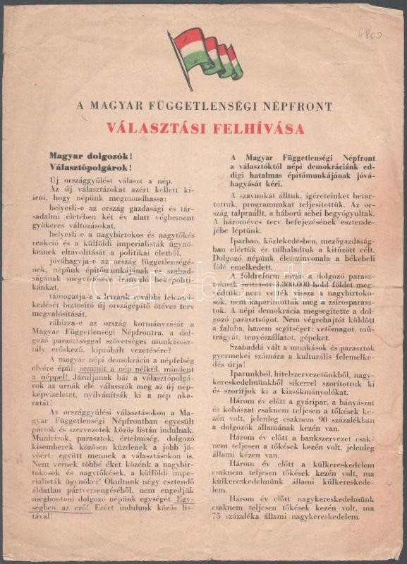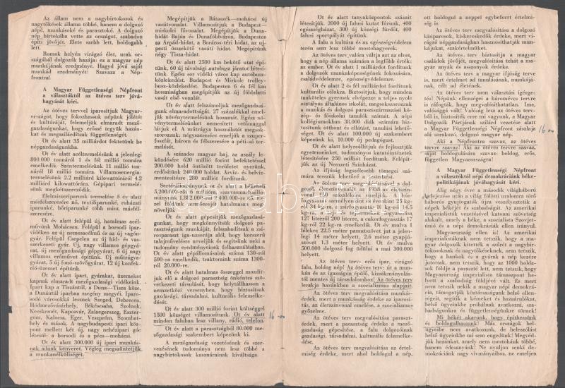 Beschreibung: cca 1949 Magyar Függetlenségi Népfront választási felhívása, ceruzás aláhúzásokkal, hajtott, 4p