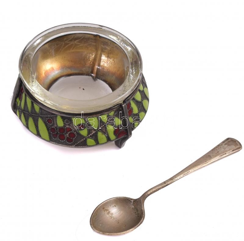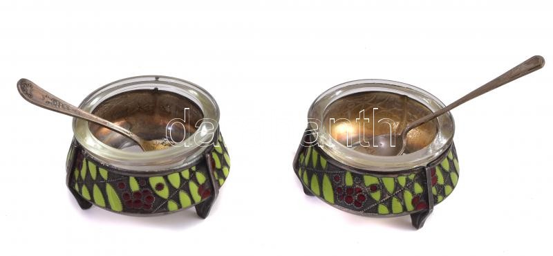Beschreibung: 2 nagyobb méretű orosz kaviár tartó edényke, kanállal. Zománcozott fém, üveg betéttel d: 6 cm