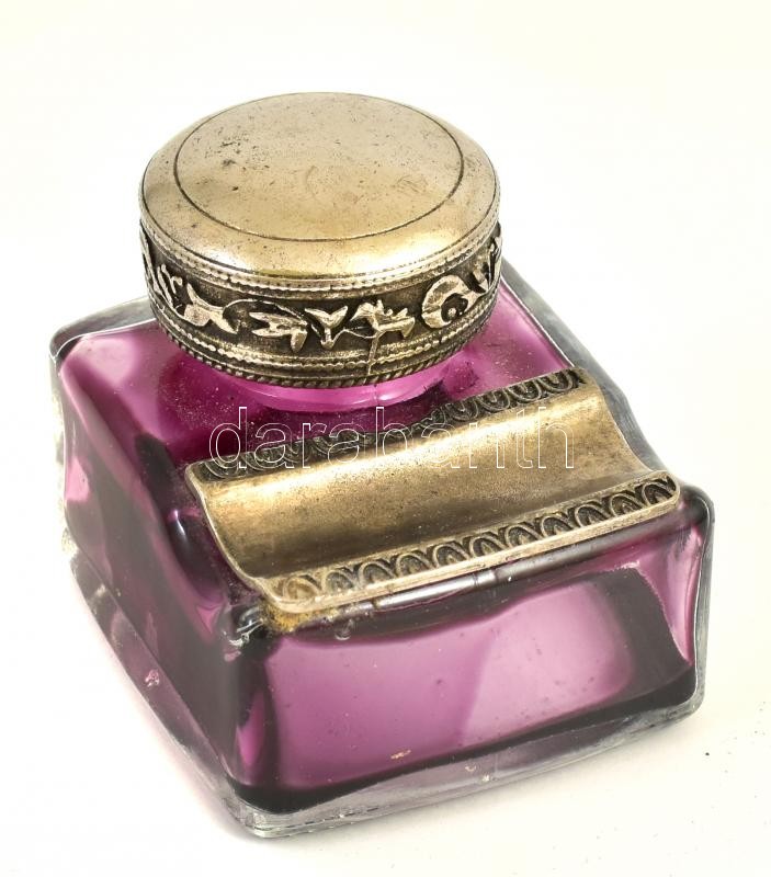 Beschreibung: Tintatartó üveg, fém kupakkal és tolltartó résszel, kis kopásnyomokkal, 5,5×5 cm
