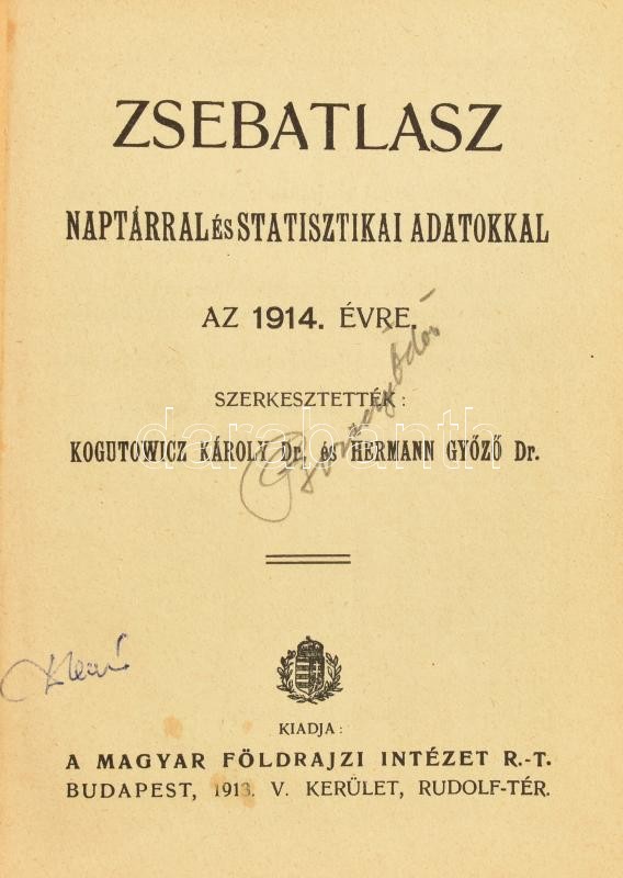 1914 Zsebatlasz naptárral és statisztikai adatokkal, szerk. Kogutowicz Károly és Hermann Győző, kiadja: Magyar Földrajzi Intézet Rt., egészvászon kötésben