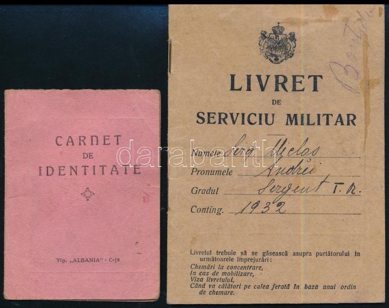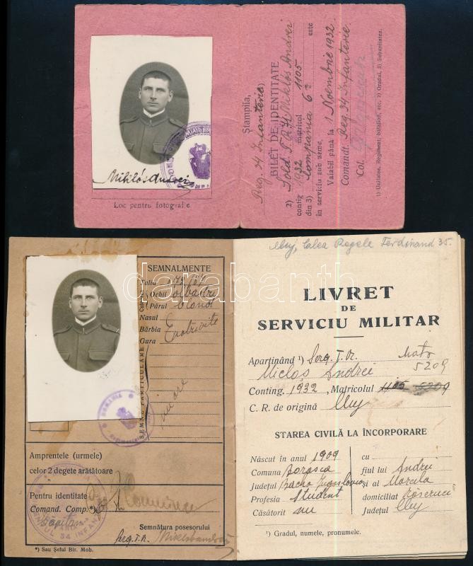 1932 2 db fényképes román katonai igazolvány erdélyi magyar személy részére: személyazonosító igazolvány + szolgálati könyv bejegyzésekkel, pecsétekkel