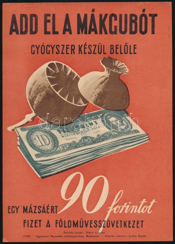 "Add el a mákgubót, gyógyszer készül belőle" villamosplakát, 23,5×16,5... https://www.darabanth.com/de/396-Fernauktion/396.0/Kunst-Dokumente-andere-Sammelgebiete/Plakat~2000022/Add-el-a-makgubot-gyogyszer-keszul-belole-villamosplakat-23-5C39716-5-cm~II2413352