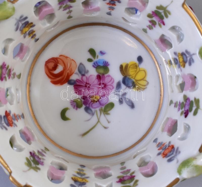 Beschreibung: Alt-Wien áttört kosárka plasztikus virág díszítéssel. Kézzel festett, jelzett, hibátlan. d: 8,5 cm