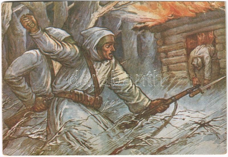 Beschreibung: 1943 Török Ferenc tizedes éjszakai vállalkozás során másodmagával semmisített meg egy erős orvlövész bandát / WWII Hungarian military art postcard s: Haranghy (EB)