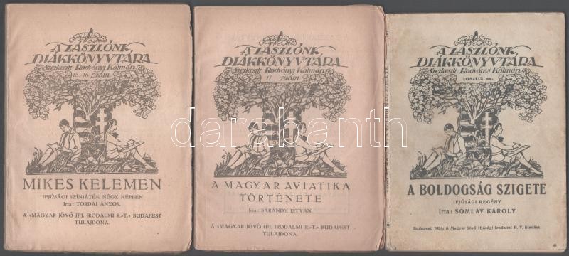 B. H. King-Waltham: A fehér pokol. Ford.: Ajtai Kálmán. A Zászlónk Könyvtára 11. sz. Bp., 1934, Élet. 59 p. Kissé szakadt kiadói papírkötés. + A Zászlónk Diákkönyvtára 4 kötete: Tordai Ányos: Mikes Kelemen. 15-16. szám; Sárándy István: A magyar aviatika története. 17. szám; Radványi Kálmán: A gelencei fényjelek. 18-19. szám; Somlay Károly: A boldogság szigete. 108-112. szám. Bp., 1921/1924, Magyar Jövő Ifjúsági Irodalmi Rt. 79+51+91+83 p. Kiadói papírkötés, helyenként kis szakadásokkal, az egyik kopott, a könyvtesttől elvált borítóval.