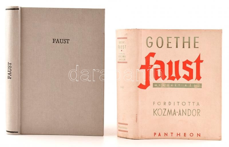[Johann Wolfgang von] Goethe: Faust. Mindkét rész. Ford.: Kozma Andor. Bp.,[1943],Pantheon, 158+231 p. Kiadói félvászon-kötés, kiadói illusztrált (jelzett a nyomaton: Fekete J.) papír védőborítóban, papír védőborítóban. Szép állapotban.+ [Johann Wolfgang von] Goethe: Faust. Ford.: Dóczi Lajos. Pest, 1873, Ráth Mór, 4+VII-VIII+I-XXII+2+205+3 p. Átkötött modern egészvászon-kötés.