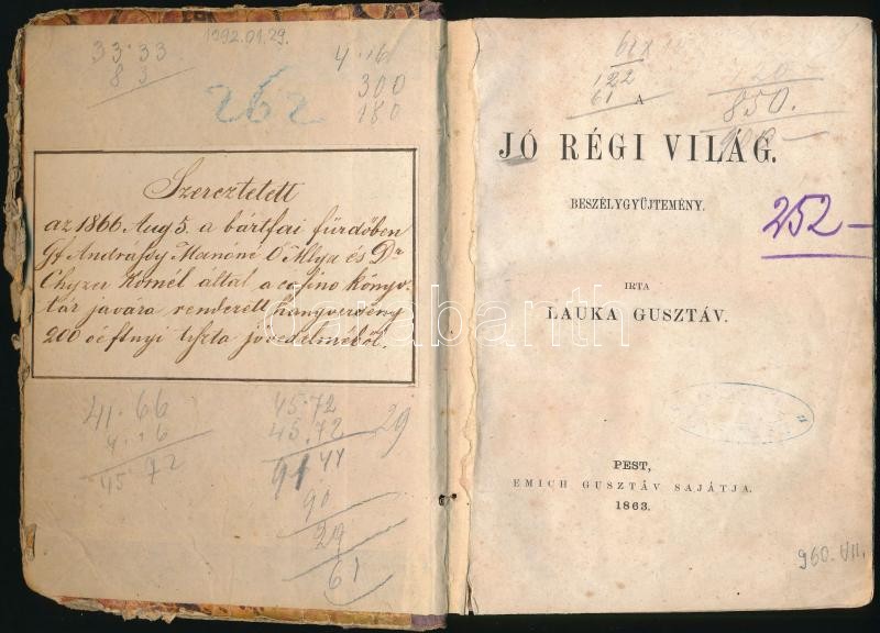 Lauka Gusztáv: A jó régi világ. Beszélygyüjtemény. Pest, 1863, Emich Gusztáv, 4+252+1 p. Átkötött félvászon-kötés, erősen kopott borítóval és sérült gerinccel, az elülső kötéstábla belsején és a címlapon különféle jegyzetekkel, kissé foltos lapokkal.