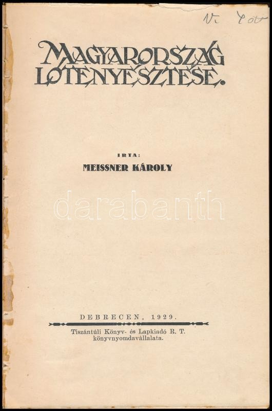 Meissner Károly: Magyarország lótenyésztése. Debrecen, 1929, Tiszántúli Könyv- és Lapkiadó Rt., 182 p. Szövegközti fekete-fehér illusztrációkkal. Átkötött félvászon-kötés, a borítón kis sérüléssel, kissé kopott borítóval, egy-két lapszélen egészen apró, minimális sérüléssel.