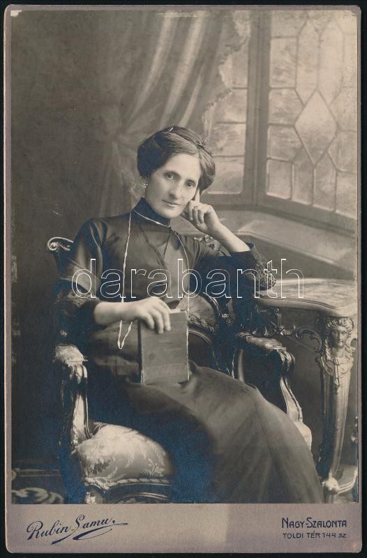 cca 1910 Nő könyvvel karosszékben, keményhátú fotó Rubin Samu nagyszal... https://www.darabanth.com/de/397-Fernauktion/397.0/Fotografie/Foto~500021/cca-1910-No-konyvvel-karosszekben-kemenyhatu-foto-Rubin-Samu-nagyszalontai-mutermebol-16~II2414200