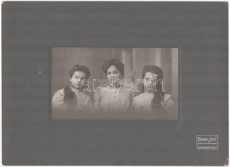cca 1921 A három grácia, kartonra kasírozott fotó Knebel Jenő cs. és udvari fényképész szombathelyi műterméből, aláírásával, hátoldalon szöveggel, 11×18,5 cm