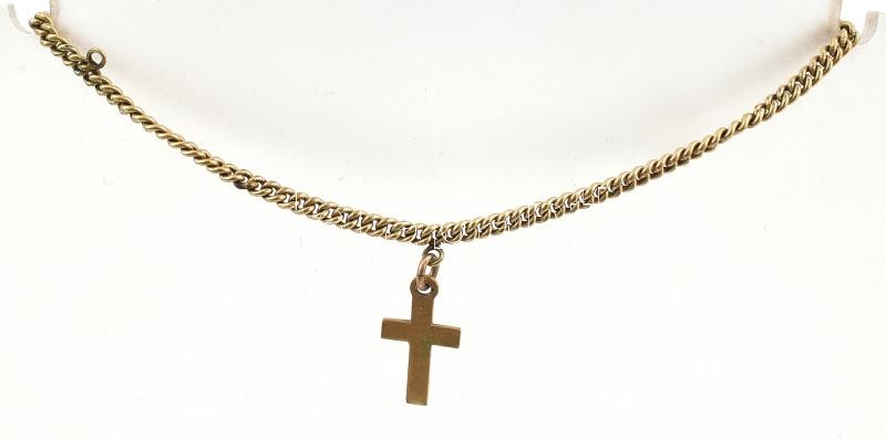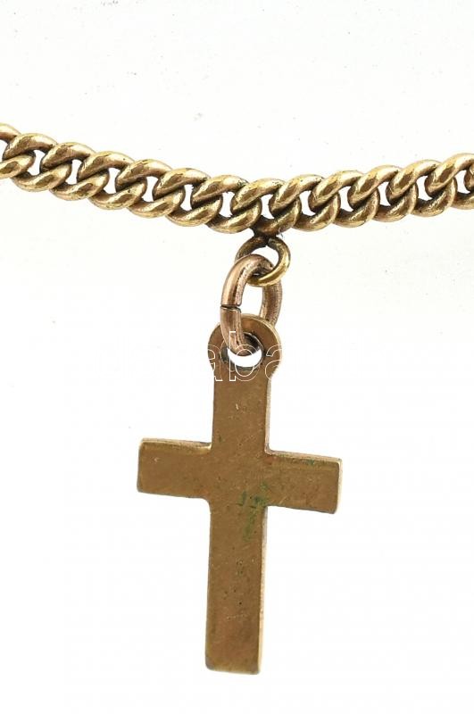 Beschreibung: 14K arany (Au) karkötő kereszt medállal, jelzett, apró elszíneződéssel, kopásnyomokkal, h: 17,5 cm, nettó: 2,3 g