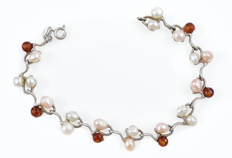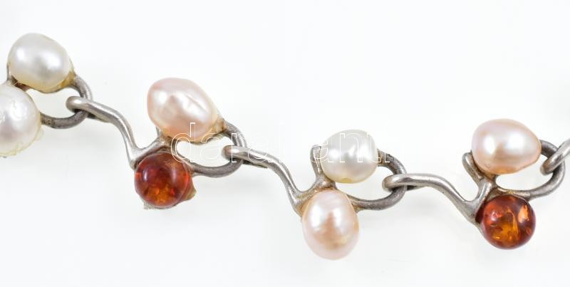 Beschreibung: Ezüst(Ag) borostyánnal és tenyésztett gyönggyel, jelzett, h: 18,5 cm, bruttó: 12,8 g