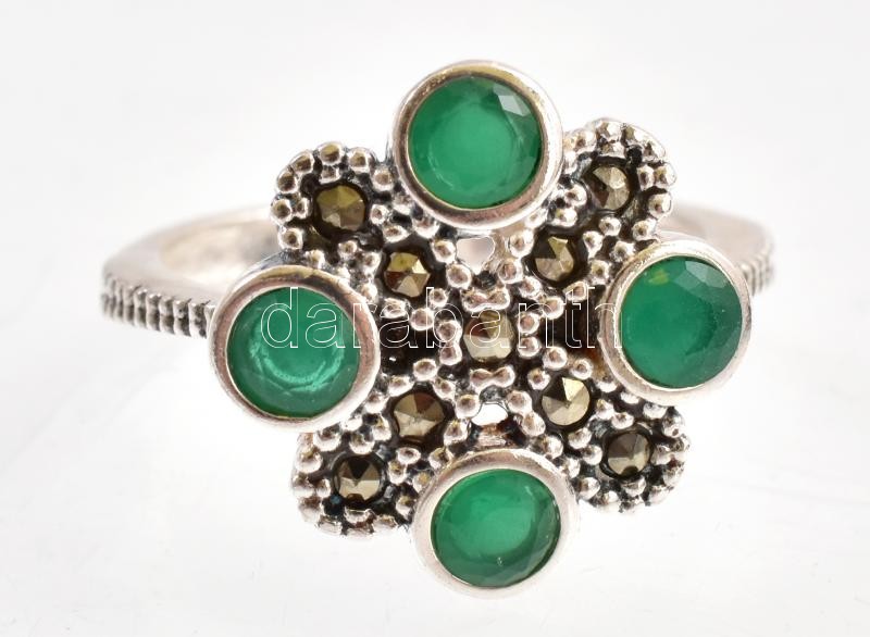 Beschreibung: Ezüst(Ag) gyűrű, zöld kövekkel, jelzett, méret: 58, bruttó: 4,49 g