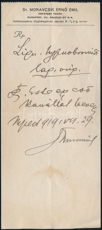 1919 Moravcsik Ernő Emil (1858-1924. október 9.) elmeorvos, a pszichiátria professzora, az MTA levelező tagja aláírása fejléces receptjén, hajtásnyommal, alsó felén szöveget nem érintő kisebb folttal