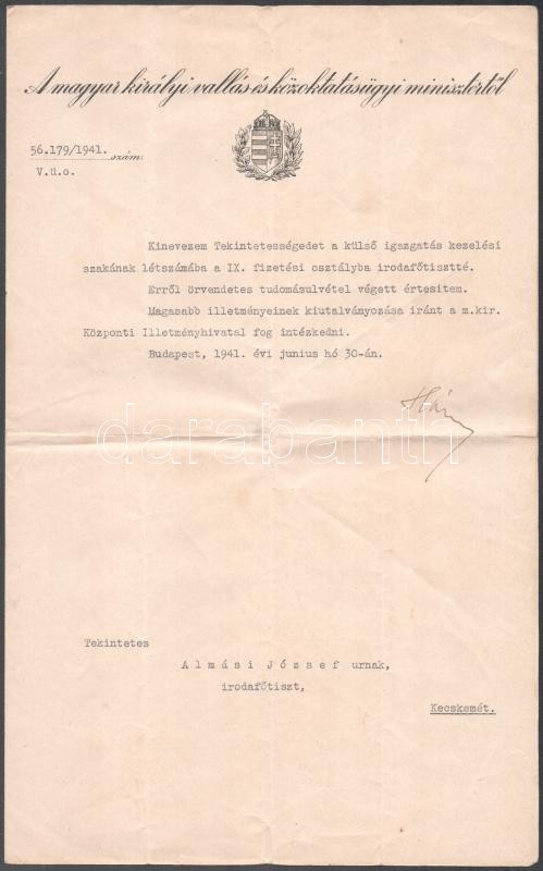 1941 Bp., Kinevezési okmány Hóman Bálint (1885-1951) vallás- és közokt... https://www.darabanth.com/de/397-Fernauktion/397.0/Kunst-Dokumente-andere-Sammelgebiete/Dokument~500018/1941-Bp-Kinevezesi-okmany-Homan-Balint-1885-1951-vallas-es-kozoktatasugyi-miniszter-al~II2420389