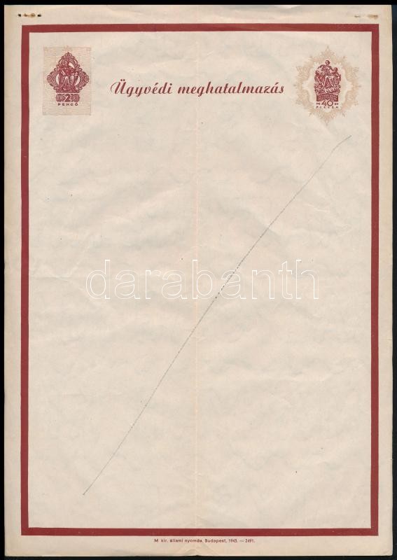 1943 Díjjegyes ügyvédi meghatalmazás, használatlan https://www.darabanth.com/de/397-Fernauktion/397.0/Kunst-Dokumente-andere-Sammelgebiete/Dokument~500018/1943-Dijjegyes-ugyvedi-meghatalmazas-hasznalatlan~II2413270
