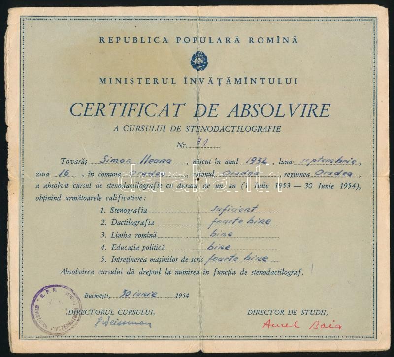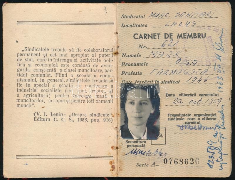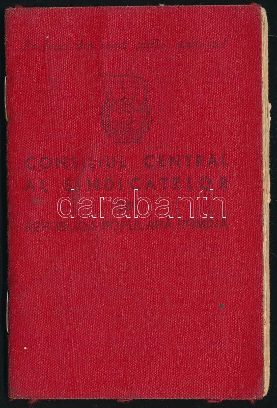 1954-1959 Román szakszervezeti tagsági igazolvány, rengeteg tagdíjbély... https://www.darabanth.com/de/397-Fernauktion/397.0/Kunst-Dokumente-andere-Sammelgebiete/Dokument~500018/1954-1959-Roman-szakszervezeti-tagsagi-igazolvany-rengeteg-tagdijbelyeggel-plus-roman-bizonyitv~II2415624