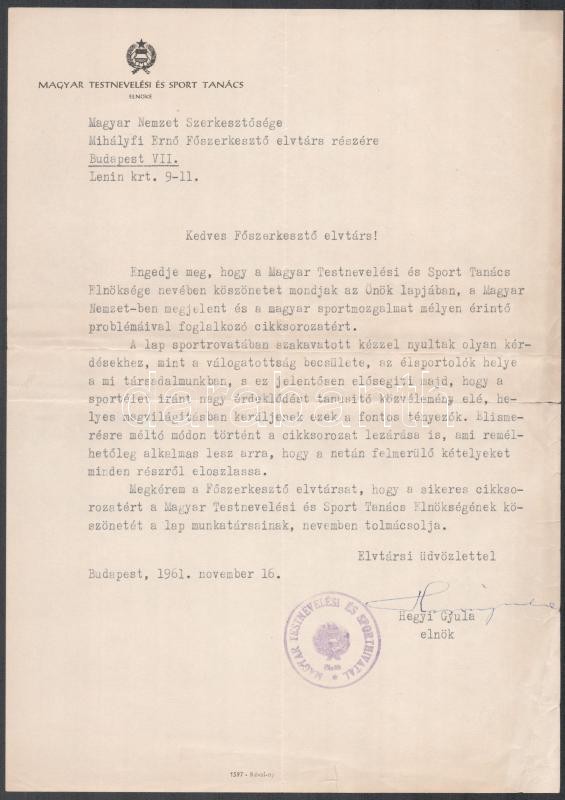 1961 Bp., Hegyi Gyula (1897-1978) sportvezető, MOB elnök aláírása kösz... https://www.darabanth.com/de/397-Fernauktion/397.0/Kunst-Dokumente-andere-Sammelgebiete/Dokument~500018/1961-Bp-Hegyi-Gyula-1897-1978-sportvezeto-MOB-elnok-alairasa-koszono-levelen~II2421867