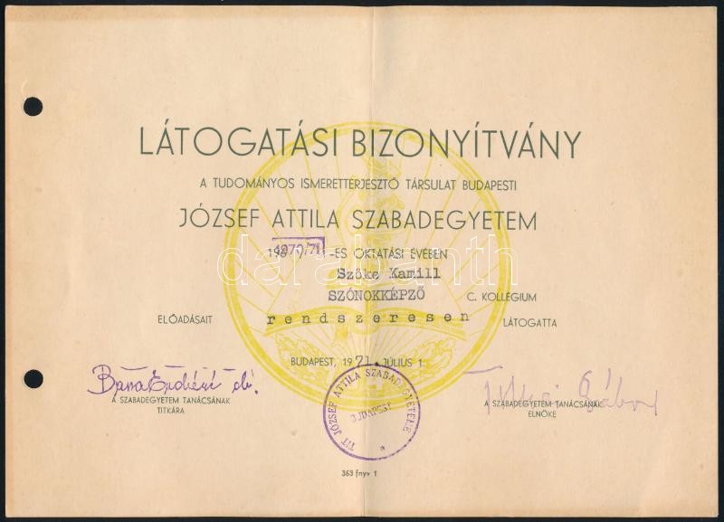 1971 Bp., József Attila Szabadegyetem szónokképző kollégiumának bizony... https://www.darabanth.com/de/397-Fernauktion/397.0/Kunst-Dokumente-andere-Sammelgebiete/Dokument~500018/1971-Bp-Jozsef-Attila-Szabadegyetem-szonokkepzo-kollegiumanak-bizonyitvanya-hajtott~II2421819