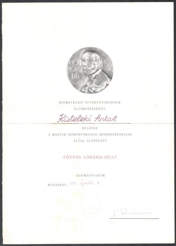Beschreibung: 1975 Bp., Eötvös Loránd-díjat adományozó oklevél Rödönyi Károly (1911-1995) miniszter aláírásával