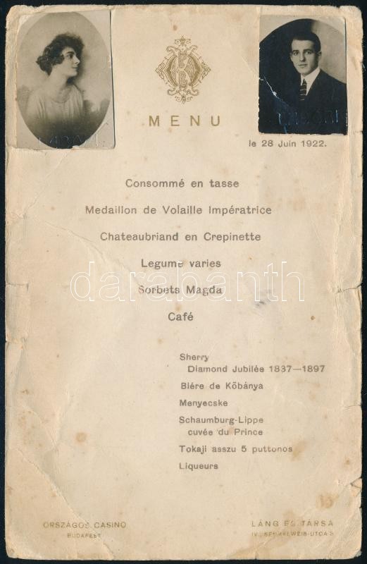 1922 Tartsay Pál esküvői menükártya két képpel, szakadozott szélekkel ... https://www.darabanth.com/de/397-Fernauktion/397.0/Kunst-Dokumente-andere-Sammelgebiete/Drucksachen~500031/1922-Tartsay-Pal-eskuvoi-menukartya-ket-keppel-szakadozott-szelekkel-11x17-cm~II2418610