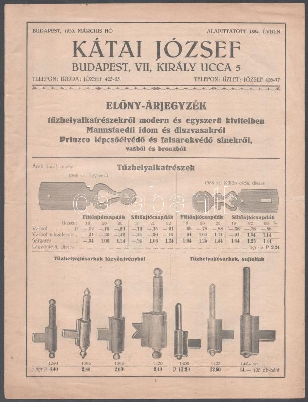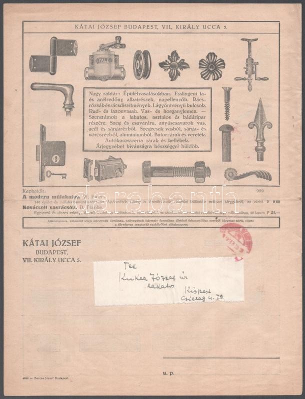 1930 Kátai József, Budapest, Király utca tűzhely- és díszvasalat-alkatrész fametszetes képekkel ellátott árjegyzéke, jó állapotban, postán elküldve, 12p