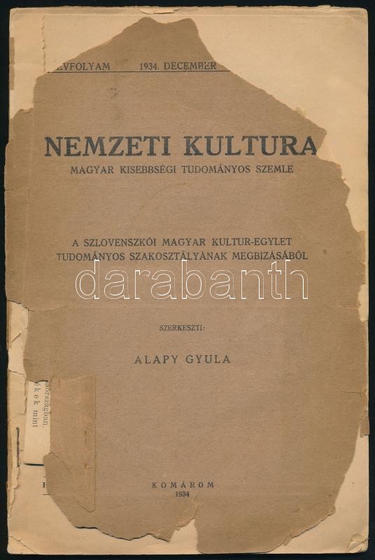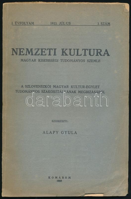 1933-34 Nemzeti Kultura, magyar kisebbségi tudományos szemle. A Szlovenszkói Magyar Kultur-Egylet tudományos szakosztályának megbízásából szerkeszti: Alapy Gyula. Komárom, 1933-34. I. évf. 3. sz., 1933 július, 4. szá,, 1933 október és 1934 dec. sz. Kiadói papírkötés, 1934 dec. sz. borítója és gerince elvált, sérült és hiányos.