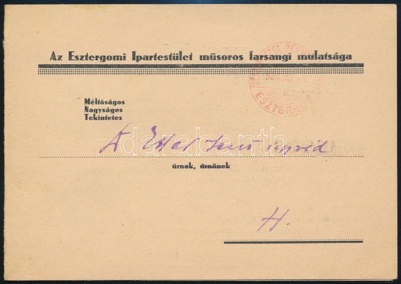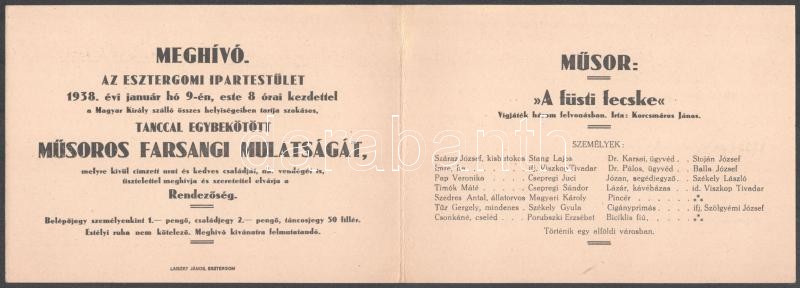 1938 Kétlapos meghívó az esztergomi ipartestület farsangi báljára https://www.darabanth.com/de/397-Fernauktion/397.0/Kunst-Dokumente-andere-Sammelgebiete/Drucksachen~500031/1938-Ketlapos-meghivo-az-esztergomi-ipartestulet-farsangi-baljara~II2420937