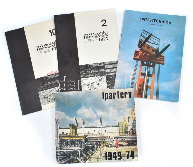 1974-1979 4 db építészeti kiadvány: Iparterv 1949-74. Szerk.: Takács Gyula. Bp., 1974, Ipari Épülettervező Vállalat. Kiadói papírkötés, kopott, kissé viseltes borítóval. 156 p. + Műszaki tervezés 1977, Építésügyi és Városfejlesztési Minisztérium, XVIII. évf. 2. és 10. sz., 44 p + 46 p. + Építéstechnika 1979. XVIII. évf. 6. sz., 24 p.