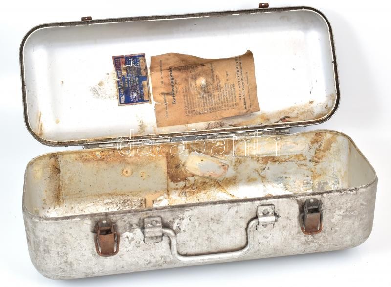 cca 1950-60 Retro fém mentőláda tartalom nélkül, kopott, kissé rozsdás... https://www.darabanth.com/de/397-Fernauktion/397.0/Kunst-Dokumente-andere-Sammelgebiete/Flohmarkt~500012/cca-1950-60-Retro-fem-mentolada-tartalom-nelkul-kopott-kisse-rozsdas-fedele-nehezen-zarul~II2417707